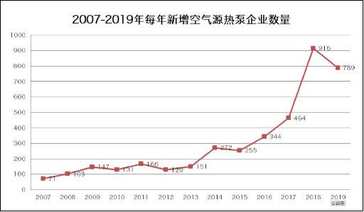 从上表可以看出,从2007年到2016年,行业的每年新增企业数量还是比较平稳的。但2017、2018、2019三年时间,行业猛增了2169家空气源热泵的“制造企业”!(不代表实际开工生产的企业数量,只代表国家工商注册信息)行业的“容量”直接翻了一番!